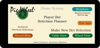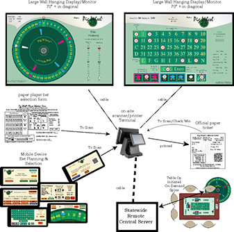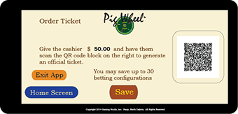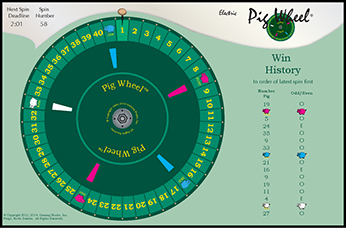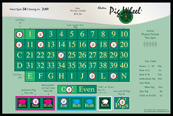The Main Game Display is meant to be a large (70"+) flat panel television or display that hangs on the bar wall. It is from this display that the wheel will go through simulated rotating spins, slowing to eventually stop at the winning number or pig. All such displays in the state would spin at the same time and would show the same number or pig as a win. The display provides players with a clock count down to the next spin and 20 - 30 seconds prior to that next spin, the clock numbers will turn red to indicate that betting for the next spin is closed. The spin number is for reference on the ticket in knowing which events the ticket was valid for use. The "Win History" merely gives players an indication of what recently won so they can check their tickets or bet according to whatever they believe past wins tell them. If a pig is shown as a win, a brief animation will show whereby that winning pig shares a very short story or thought about themselves, the other pigs, those disturbed birds or something entirely else.