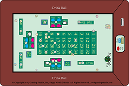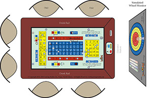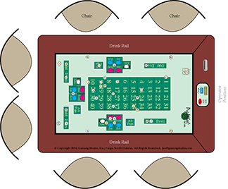 Conduct Summary and Comparison to Existing: The existing Minnesota Tri-Wheel® has players passing money to the wheel operator who then provides the player chips of equivalent value. The cash is plunged into a double locking drop box mounted and locked to the table. So far, this is exactly what will happen on the electronic table; however, the chips are virtual and the operator does not need to count them out. Instead, the operator enters the amount received and the denomination of the chips desired by the player, the computer provides the right quantity of chips to the position at the table the player is sitting (1 - 6 beginning on the left of the operator). Each position has different colored chip rim combinations.