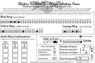 Once the player has marked their selections on the paper form, they provide the form and, in this case, $50 (10 consecutive spins at $5.00 each) to a clerk or bartender in Minnesota. The Form is scanned into the statewide central computer server and an official ticket is printed. It is likely that regulations would allow players to buy no more than ten consecutive spins.