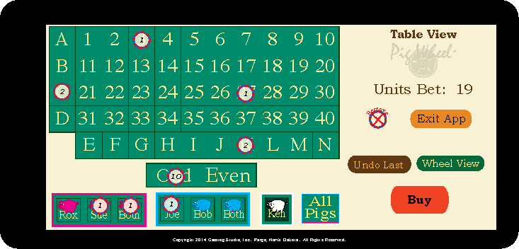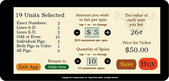 The value of a unit is determined once a player decides how much they wish to bet per spin. In the example to the left, the player has chosen 20 units to wager. Note the only place the player could select more than one unit is on "Odd" and "Even." The player chose 10 units of "Even" along with two exact numbers, lines A, C, G and K for 4 units and two exact pigs, Sue and Joe, along with Any Blue Pig and Any Pig of any color. The player has then elected to bet $5.00 per spin. Dividing $5.00 by 20 units means that each unit is worth 25¢. Thus if number 3 wins, the prize would be 40 x 25¢ = $10.00 + Line A 25¢ x 4 = $2.00 + Line G for 25¢ x 8 = $2.00 or for the ticket, $14.00.