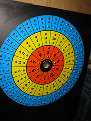 While the Richardson's earliest written plan for electronic wheels was prepared in 1990, the wheel to the left was actually built and functioning in as a rudimentary prototype in 1992. The wheel to the left had a green and a red light in each segment of each of the three rings of the wheel. The red lights in each ring were considered "Track A" while the green lights were "Track B." A separate circuit board controlled each of the six light tracks. A charitable version of the wheel would have only Track A lights, thereby having 3 random events for each spin. Players could bet each of the rings as they currently do with regard for the mechanical wheel or they could bet a combination of one number in each of two or three independently randomized rings for a higher payout. The wheel shown, with three Track A events and three Track B events allowed for a 1:64,000,000 probability of matching the exact number in six independently random rings in a single integrated spin. That probability would make the game ripe for lottery as a replacement or augmentation to the draw games using balls.