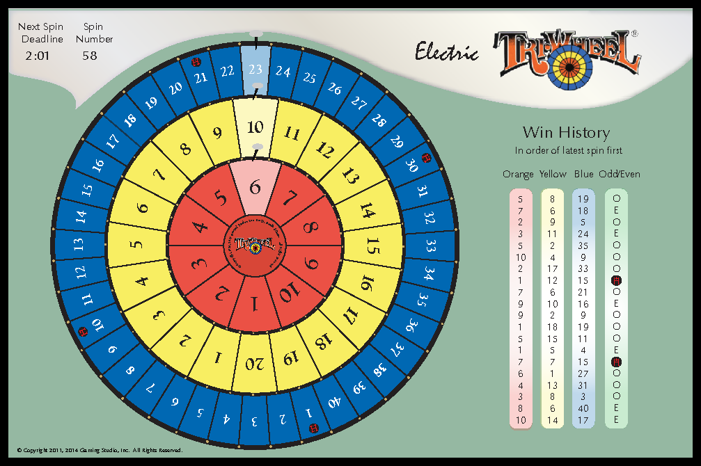 Think of the display below as a 70” diagonal monitor (65” x 43”) hanging against a wall in the bar or gaming area -- maybe two of them in different rooms. The wheel is about 38” in diameter. Every 4 or 5 minutes, the wheel goes into a simulated spin whereby each of the three rings spin fast to begin and then slows, and slows, and slows, click, click, click until they each come to a stop.