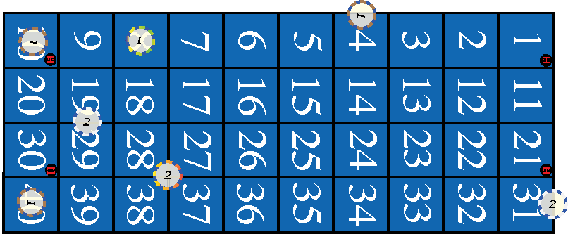The symbol appears on the Blue Ring of the wheel as well as the layout on four different numbers (1, 10, 21, 30). If one of those numbers is indicated as a winner, all "odd" and "even" bets lose. This exists in the game today; however, here we provide players an ability to bet the numbers as a hedge against losing their "odd" and "even" bets.